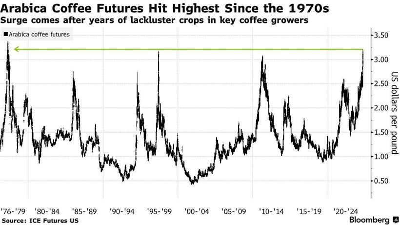 Οι κόκκοι Arabica - η ποικιλία που προτιμάται για τις ειδικές παρασκευές - σκαρφάλωσαν έως και 3,9%, σημειώνοντας το υψηλότερο επίπεδο από το 1977. Έχουν σημειώσει άλμα σχεδόν 70% φέτος.