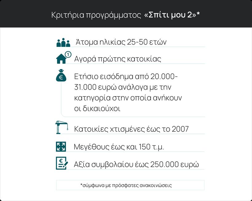 Το πρόγραμμα «Σπίτι μου 2» προσφέρει ευνοϊκότερους οικονομικούς όρους για την αγορά πρώτης κατοικίας, σε μια περίοδο αυξανόμενων τιμών στην κτηματαγορά. Στοχεύει σε νέους και ζευγάρια 25-50 ετών, προσφέροντας επιδοτούμενα δάνεια με εισοδηματικά κριτήρια, προσαρμοσμένα ανά οικογενειακή κατάσταση.