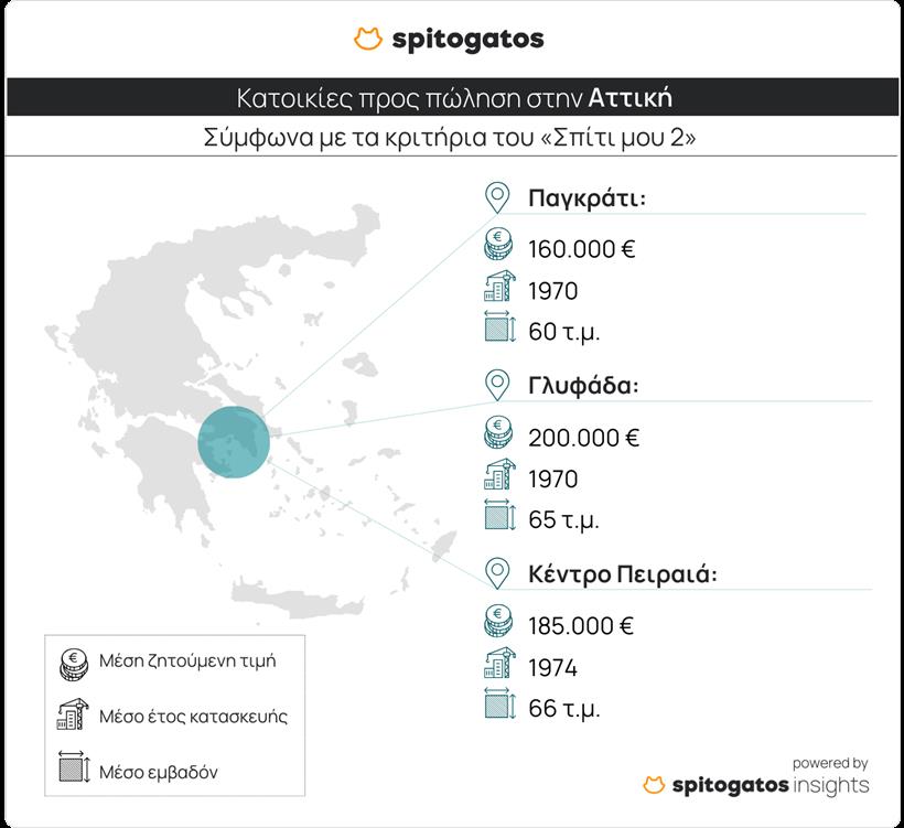 Εστιάζοντας περισσότερο στην περιοχή του Κέντρου της Αθήνας, παρατηρούμε ότι μία κατοικία που θα μπορούσε να αποκτηθεί μέσω του προγράμματος «Σπίτι μου 2» στο Παγκράτι, έχει μέση ζητούμενη τιμή 160.000 €, μέσο εμβαδόν 60 τ.μ. και μέσο έτος κατασκευής το 1970. Αντίστοιχα στη Γλυφάδα, στα Νότια Προάστια της Αττικής, μία κατοικία που πληροί τα κριτήρια του προγράμματος διατίθεται κατά μέσο όρο στις 200.000 €, κατασκευάστηκε επίσης γύρω στο 1970 και έχει μέσο εμβαδόν 65 τ.μ. Στο Κέντρο του Πειραιά, μία αντίστοιχη κατοικία έχει μέση τιμή στις 185.000 €, μέσο εμβαδόν 66 τ.μ. και έτος κατασκευής το 1974.