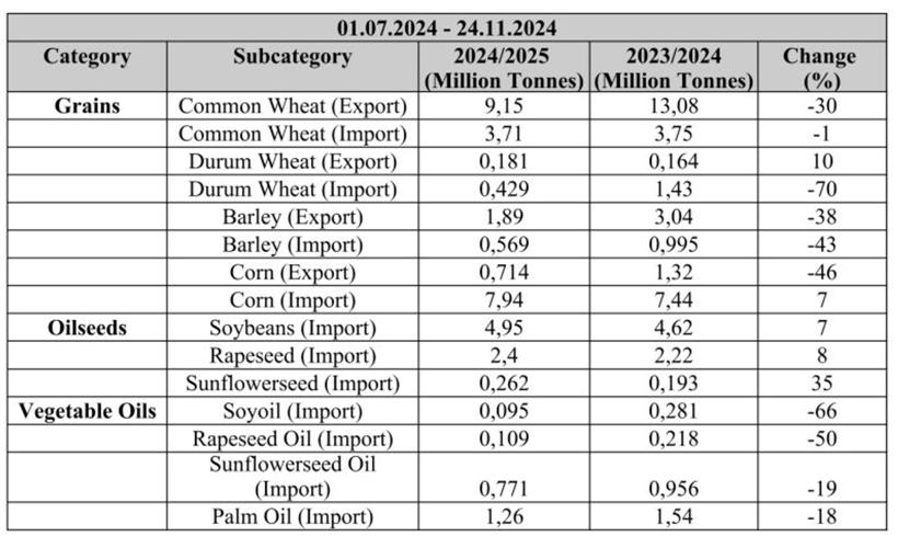 Οι εισαγωγές ελαιούχων σπόρων παραμένουν ισχυρές, με τους σπόρους σόγιας να καταγράφουν αύξηση 7%, τους σπόρους ελαιοκράμβης 8% και τους ηλιόσπορους 35%. Η διαρκής ζήτηση για αυτές τις πρώτες ύλες αντανακλά την αυξανόμενη ανάγκη για παραγωγή φυτικών ελαίων και ζωοτροφών.