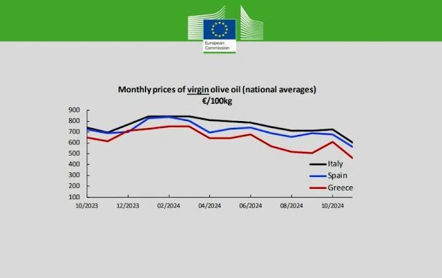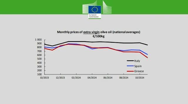 Οι τιμές για το έξτρα παρθένο ελαιόλαδο στην Ελλάδα, το Νοέμβριο, διαμορφώνεται στα 5,33 ευρώ το κιλό, ενώ στην Ισπανία στα 6,15 ευρώ και στην Ιταλία στα 8,61 ευρώ.
