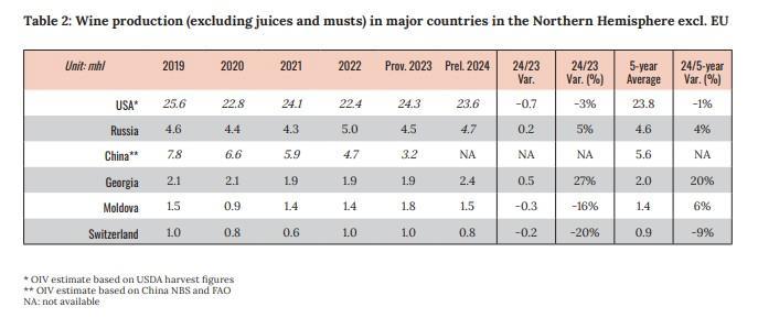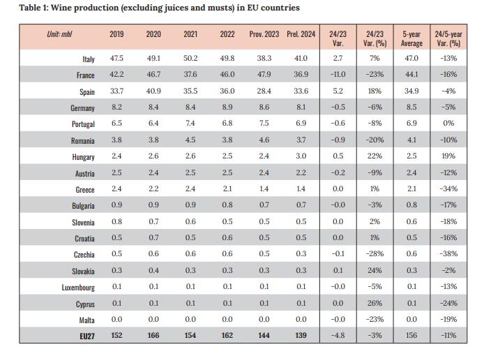 Η Ιταλία παραμένει στην κορυφή της παγκόσμιας παραγωγής με 41 εκατομμύρια εκατόλιτρα, παρουσιάζοντας μικρή ανάκαμψη (+7%) από το 2023. Αντίθετα, η Γαλλία κατέγραψε πτώση 23%, φτάνοντας τα 36,9 εκατομμύρια εκατόλιτρα, ενώ η Ισπανία παρουσίασε αύξηση 18%, φτάνοντας τα 33,6 εκατομμύρια εκατόλιτρα.