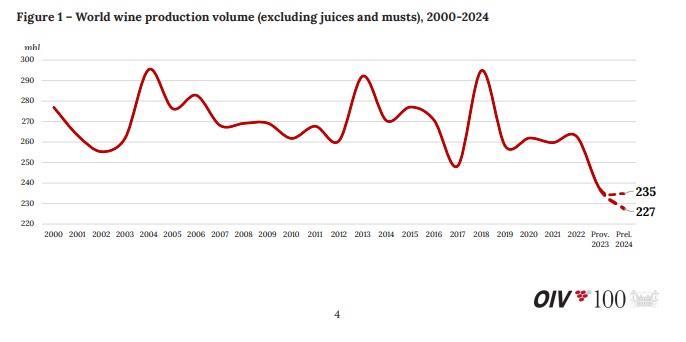 Η παγκόσμια παραγωγή οίνου για το 2024 αναμένεται να φτάσει τα 23,1 δισεκατομμύρια λίτρα, σύμφωνα με τις πρώτες εκτιμήσεις του Διεθνούς Οργανισμού Αμπέλου και Οίνου (OIV). Η ποσότητα αυτή αποτελεί το χαμηλότερο επίπεδο παραγωγής από το 1961, με τη μείωση να ανέρχεται σε 2% σε σχέση με το ήδη χαμηλό επίπεδο του 2023 και 13% χαμηλότερα από τον μέσο όρο της τελευταίας δεκαετίας.