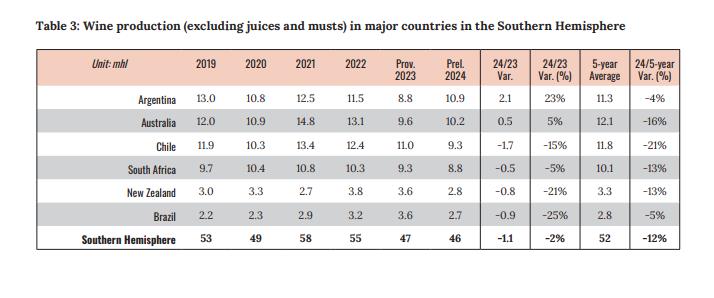 Στο Νότιο Ημισφαίριο, όπου η παραγωγή μειώθηκε κατά 12% σε σχέση με τον μέσο όρο πενταετίας, η Αργεντινή παρουσιάζει ανάκαμψη (+23%), ενώ η Χιλή και η Βραζιλία κατέγραψαν σημαντική μείωση λόγω δυσμενών καιρικών συνθηκών.