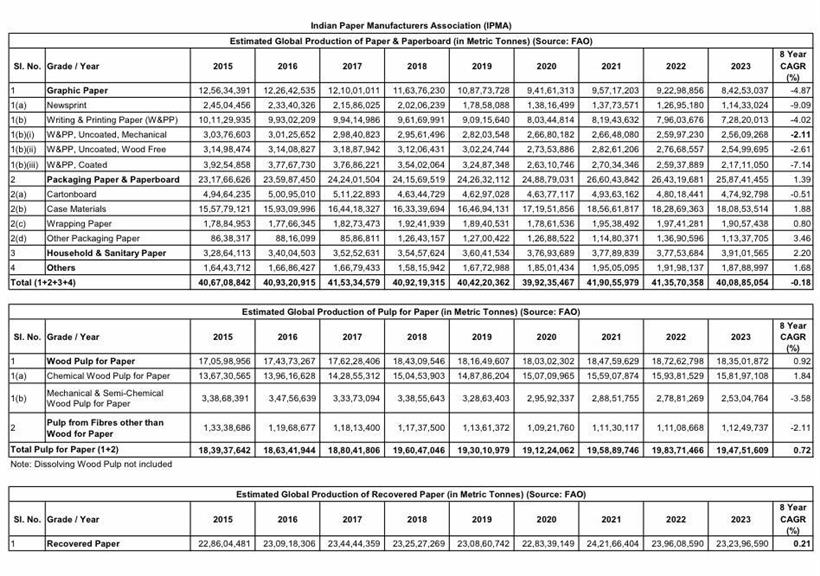 Σύμφωνα με τα στοιχεία της Indian Paper Manufacturers Association (IPMA), η παγκόσμια παραγωγή χαρτιού και χαρτονιού παρέμεινε σχετικά σταθερή τα τελευταία χρόνια, με συνολικό όγκο που άγγιξε τους 408 εκατομμύρια τόνους το 2023.