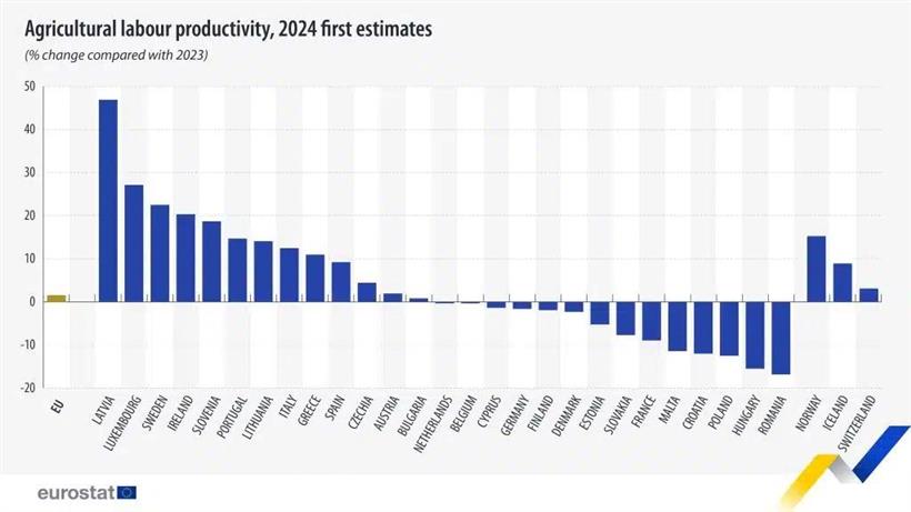 Η παραγωγικότητα της γεωργικής εργασίας αυξήθηκε σε 13 χώρες της ΕΕ το 2024. Το υψηλότερο ποσοστό αύξησης καταγράφηκε στη Λετονία (+46,9%), ακολουθούμενη από το Λουξεμβούργο (+27,1%) και τη Σουηδία (+22,5%).