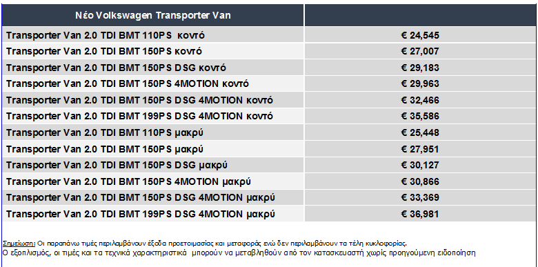 Oι τιμές του νέου Transporter 6.1 VAN διαμορφώνονται ως εξής: