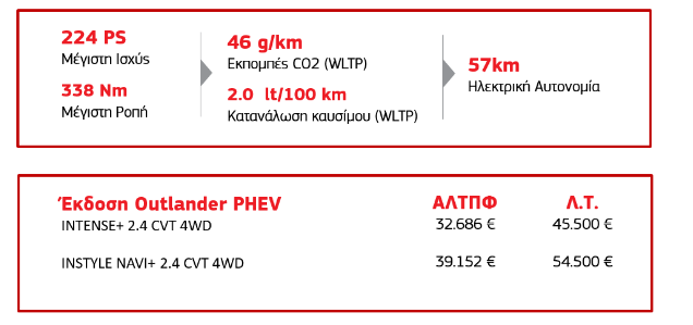 Σε συνέχεια των μεταρρυθμίσεων που αφορούν την φορολόγηση των εταιρικών χρηστών,το νέο OutlanderPHEV, με εκπομπές CO2 μόλις 46g/km, είναι το μοναδικό τετρακίνητο SUVμεγάλης κατηγορίας της ελληνικής αγοράς που πληροί τις προϋποθέσεις μηδενικού φόρου για τους εταιρικούς χρήστες βάσει των παρακάτω στοιχείων που απορρέουν από το σχετικό ΦΕΚ: