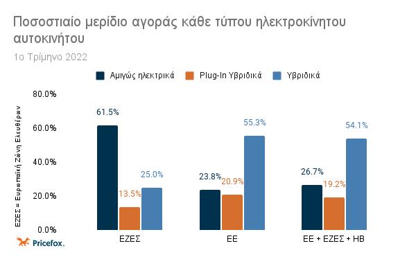Από τις τρεις κατηγορίες ηλεκτροκίνησης, η πιο δημοφιλής παραμένει η υβριδική στην Ευρωπαϊκή Ένωση. Παρατηρείται όμως μια άνοδος της προτίμησης στα αμιγώς ηλεκτρικά αυτοκίνητα έναντι των Plug-In υβριδικών μοντέλων την περίοδο Ιανουαρίου-Μαρτίου του 2023 σε σχέση με την ίδια περίοδο του 2022.