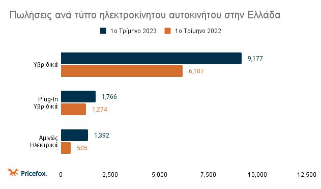 Στο πρώτο τρίμηνο του έτους, οι πωλήσεις στα υβριδικά μοντέλα επέκτειναν το προβάδισμά τους έναντι άλλων τεχνολογιών φτάνοντας τα 9.177 έναντι των 6.187 την ίδια περίοδο του 2022., μία αύξηση 48%.