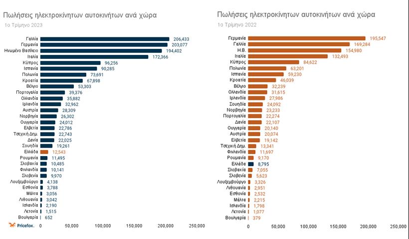 Η κορυφαία χώρα με το μεγαλύτερο αριθμό πωλήσεων ηλεκτροκίνητων αυτοκινήτων το πρώτο τρίμηνο του 2023 ήταν η Γαλλία με 206.433 πωλήσεις η οποία ξεπέρασε οριακά τη Γερμανία (203.077), τον περσινό πρωταθλητή.
