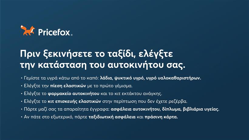 Ο Αύγουστος μας περιμένει στη γωνία και οι διακοπές για πολλούς έχουν ήδη αρχίσει. Για όσους έχουν προγραμματίσει ταξίδι με το αυτοκίνητο για τις επόμενες ημέρες, το Pricefox, ο σύμβουλος σας στην εξοικονόμηση, υπενθυμίζει τι πρέπει να κάνουμε πριν από ένα μεγάλο ταξίδι.