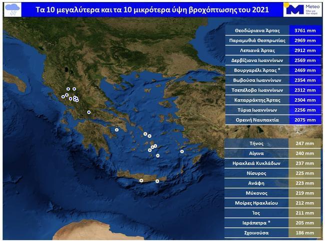 Τα μικρότερα ετήσια ύψη βροχόπτωσης εντοπίστηκαν στις Κυκλάδες, στη Νότια Κρήτη και στα Δωδεκάνησα. Το ρεκόρ ξηρασίας για το 2021 κατέχει η Σχοινούσα (μόνο 186 χιλιοστά βροχής) και ακολούθησαν Ιεράπετρα (205), Ίος (211), Μοίρες Ηρακλείου (212), Μύκονος (219), Ανάφη (223) και Νίσυρος (225).