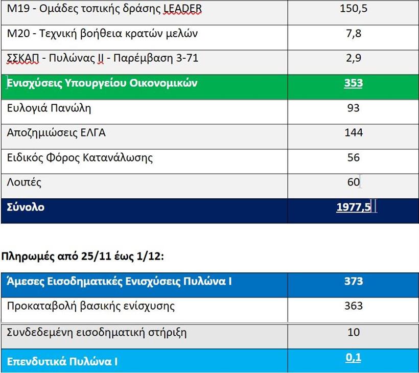 Νέα επικαιροποιημένα στοιχεία από πηγές της Αντιπροεδρίας της Κυβέρνησης και του Υπουργείου Αγροτικής Ανάπτυξης και Τροφίμων αποτυπώνουν το ύψος των ενισχύσεων που έχουν δοθεί στους αγρότες για το 2025. Σύμφωνα με τα δεδομένα, από την 1η Ιανουαρίου έως την 1η Δεκεμβρίου έχουν καταβληθεί 2,48 δισ. ευρώ.