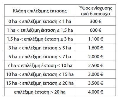 1. Ο υπολογισμός του ύψους ενίσχυσης πραγματοποιείται ανά δικαιούχο σύμφωνα με την κλάση εκταρίων της επιλέξιμης έκτασης.