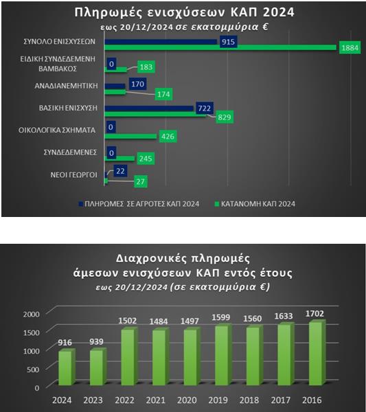 Παρακάτω παρατίθενται δύο πίνακες: ένας για τις πληρωμές ενισχύσεων της ΚΑΠ για το 2024 και ένας για τις διαχρονικές άμεσες ενισχύσεις της ΚΑΠ από το 2016 μέχρι το 2024.