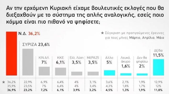 Πιο συγκεκριμένα, η ΝΔ συγκεντρώνει το ποσοστό του 36,2% έναντι 23,6% της Αξιωματικής Αντιπολίτευσης, με τη διαφορά να ανέρχεται σε 12,6 ποσοστιαίες μονάδες. Ακολουθεί το ΚΙΝΑΛ στην τρίτη θέση με 7%, το ΚΚΕ με 6,1%, η Ελληνική Λύση με 3,5% και το ΜΕΡΑ25 και αυτό με 3,5%.