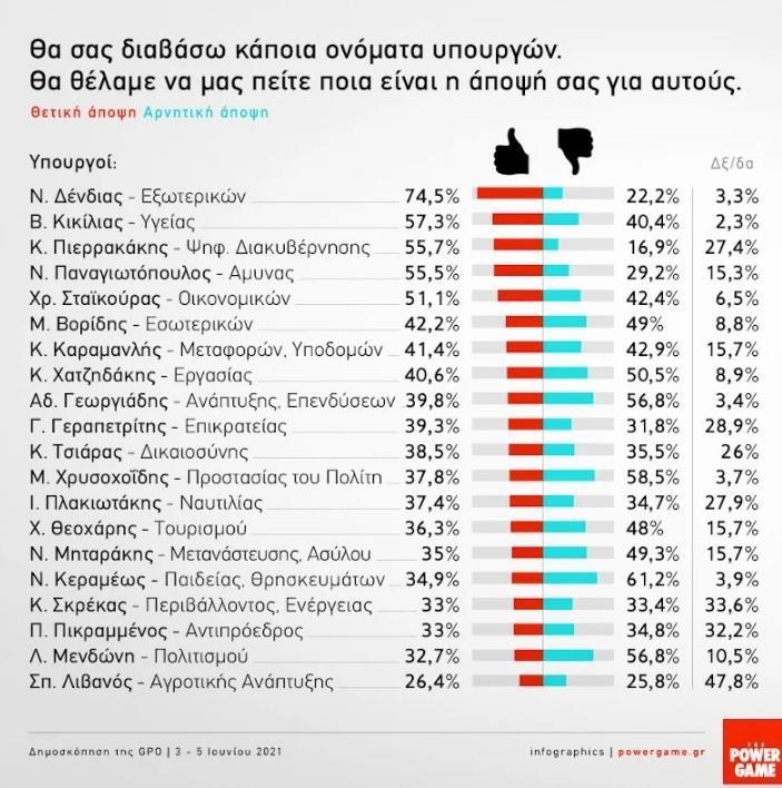 Ο Νίκος Δένδιας είναι στην πρώτη θέση της αξιολόγησης με 74,5% ενώ δεύτερος ακολουθεί ο υπουργός Υγείας κ. Βασ. Κικίλιας με 57,3%. Στην τρίτη θέση δημοτικότητας βρίσκεται πλέον ο υπουργός Ψηφιακής Διακυβέρνησης κ. Κυρ. Πιερρακάκης (55,7%), κάτι που ασφαλώς συσχετίζεται με τις επιδόσεις τόσο στον εμβολιασμό όσο και στην ψηφιοποίηση νευραλγικών υπηρεσιών προς τους πολίτες.