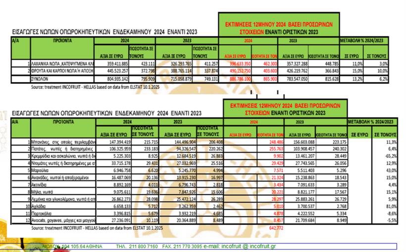 Το 2024 τελείωσε με αύξηση και καταγραφή ρεκόρ, για άλλη μια χρονιά, των ελληνικών εξαγωγών νωπών φρούτων και λαχανικών κατά 8,2%, και θα ξεπεράσει τα 1,861 δισεκατομμύρια ευρώ, σύμφωνα με εκτιμήσεις του Συνδέσμου μας Incofruit-Hellas. έτος κατά το οποίο και οι εισαγωγές εκτιμάται ότι αυξήθηκαν κατακόρυφα, 13,6% βάσει επισήμων στοιχείων ενδεκαμήνου 2024 και προσωρινών στοιχείων για τον Δεκέμβριο. Η ανησυχία πάνω από καθοριστικούς παράγοντες στον παραγωγικό τομέα έχει επίσης αυξηθεί, όπως για την έλλειψη υδάτινων πόρων αλλά και για την αύξηση του κόστους παραγωγής που τα καθιστούν μη ανταγωνιστικά έναντι των εισαγομένων από τρίτες χώρες χαμηλού κόστους