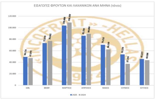 Με βάση προσωρινά στοιχεία εκτιμάται ότι οι εισαγωγές συνεχίσθηκαν με αυξημένους ρυθμούς με το α’ επτάμηνο 2025 να καταγράφει συνολικά εισαγωγές 480,07 χιλ. τόνων φρούτων και λαχανικών έναντι 463,93 χιλ. τόνων το αντίστοιχο διάστημα 2024 αυξημένες κατά 3,48%