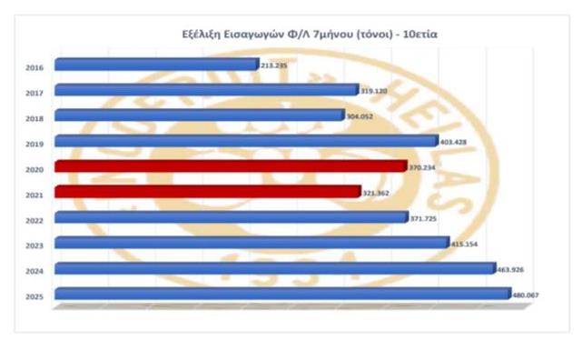 Ιδιαίτερο ενδιαφέρον παρουσιάζει η αύξηση των εισαγωγών τη τελευταία 1οετία που για το αντίστοιχο χρονικό διάστημα του Α επταμήνου παρουσιάζεται αύξηση +123% και μετά τον covid +49,4%