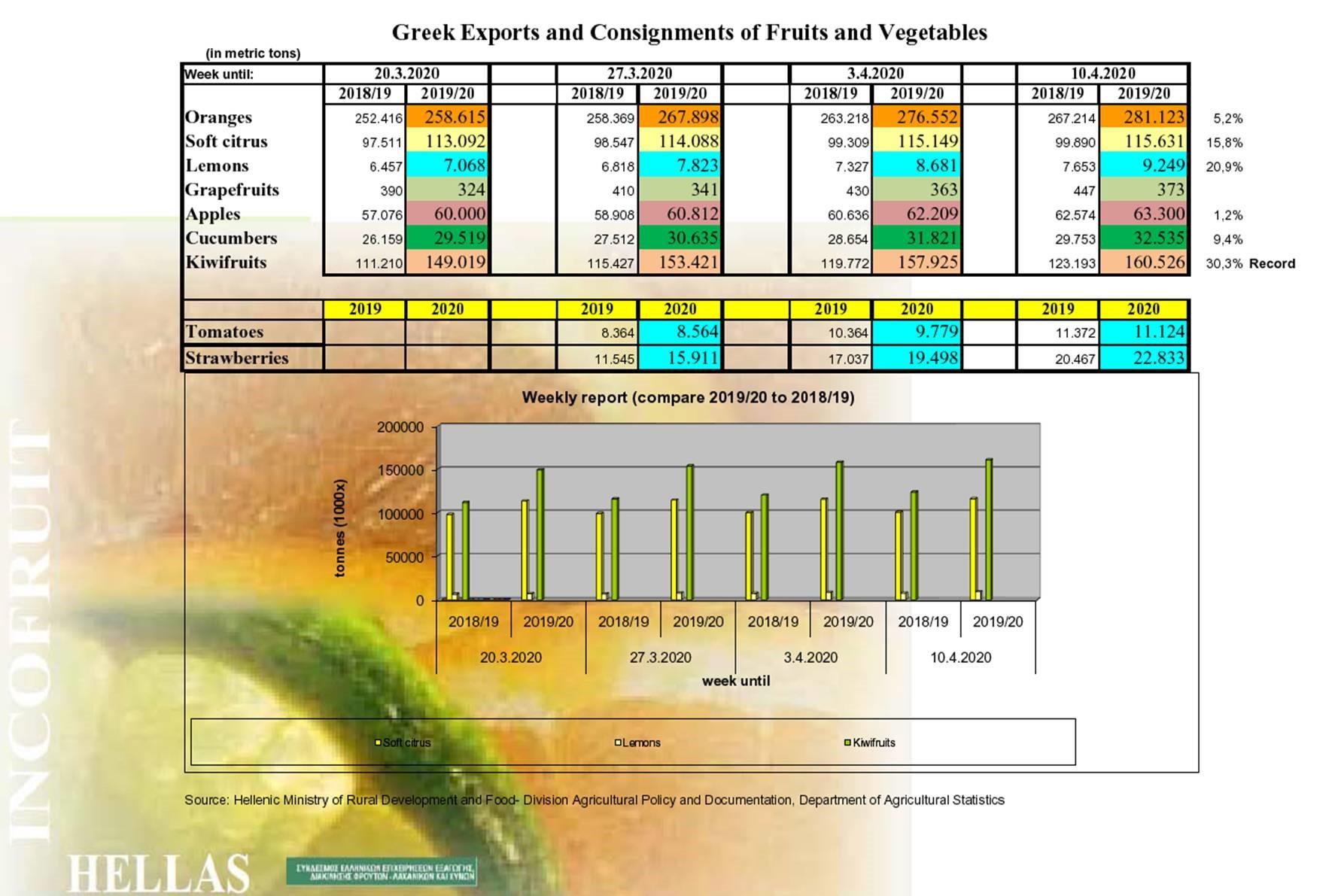 Η εξαγωγή τοματών και φράουλας (1/1/20-10/4/20) ανέρχεται σε 11.124 και 22.833 αντίστοιχα έναντι της περσινής 1/1/19-10/4/19 με 11.372 και 20.467 τόνους τοματών & φράουλας διαπιστώνοντας ελαφριά ανάκαμψη της ροής εξαγωγής τους έναντι προηγούμενης εβδομάδος