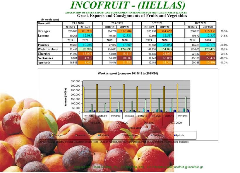 Οι εξαγωγές ροδακίνων είναι μειωμένες κατά -20,% σε 37.173.έναντι 46.453 τόνους με την εμπορεύσιμη παραγωγή στα ίδια με πέρσυ επίπεδα και την ποιότητα και τιμές σε ικανοποιητικά επίπεδα Επισημαίνεται ότι θα πρέπει να μελετηθούν προληπτικά μέτρα για αντιμετώπιση παρόμοιων φαινομένων με τα καρπούζια στις όψιμες ποικιλίες Επίσης οι εξαγωγές των νεκταρινιών παρουσιάζουν ζήτηση και η εμφανιζόμενη μείωση οφείλεται σε οψίψηση της συγκομιδής Οι εξαγωγές των βερικόκκων -17,3% σε 16.808.έναντι 20.336 τόνους , λόγω μειωμένης παραγωγής