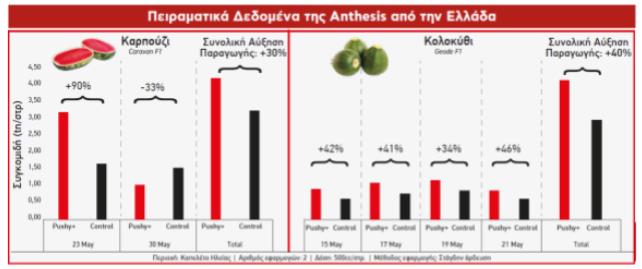 Θεαματικά τα αποτελέσματα των πειραματικών του Pushy+ την χρονιά που μας πέρασε. Πιο συγκεκριμένα την άνοιξη του 2021 στην ευρύτερη περιοχή της Ηλείας ξεκίνησε ο κύκλος πειραματικών του συγκεκριμένου προϊόντος σε καλλιέργειες Καρπουζιού και Κολοκυθιού υπό κάλυψη. Οι μετρήσεις της απόδοσης σε κάθε ημερομηνία συγκομιδής και ταυτόχρονα των ποιοτικών χαρακτήρων των καρπών, υπέδειξαν σαφή υπεροχή του Pushy+ σε σχέση με την πρακτική που ακολουθούσε ο κάθε παραγωγός. Στα διαγράμματα που ακολουθούν φαίνεται η αύξηση της πρωίμισης στο καρπούζι, με το μεγαλύτερο μέρος της παραγωγής να ‘’έρχεται’’ στο πρώτο χέρι. Στο κολοκύθι, σταθερά, είχαμε αύξηση της απόδοσης σε κάθε χέρι ενώ και στις δύο καλλιέργειες οι καρποί ήταν ποιοτικά ανώτεροι σε σχέση με τον μάρτυρα.