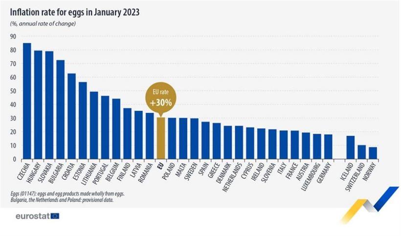 Μεταξύ των χωρών της ΕΕ, η υψηλότερη αύξηση του ετήσιου πληθωρισμού για τα αυγά καταγράφηκε στην Τσεχία (+85 % τον Ιανουάριο του 2023 σε σύγκριση με τον Ιανουάριο του 2022), ακολουθούμενη από την Ουγγαρία (+80 %) και τη Σλοβακία (+79 %).