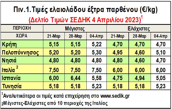 Τελικά, σύμφωνα με το Δελτίο τιμών του ΣΕΔΗΚ www.sedik.gr της 4 Απριλίου 2023 (www.sedik.gr), το διεθνές επίπεδο τιμών διαμορφώνεται ως εξής (Πιν.1) :
