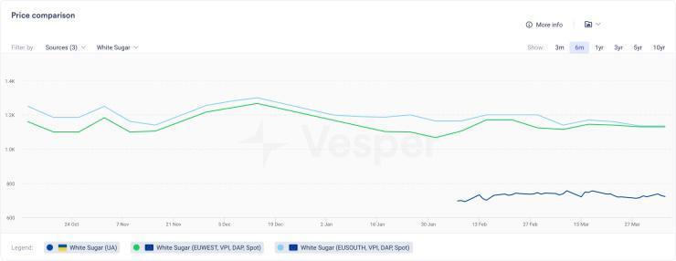 Η κατάργηση των δασμών από την ΕΕ στις εισαγωγές λευκής ζάχαρης επέτρεψε στην Ουκρανία να προσφέρει ιδιαίτερα ανταγωνιστικές τιμές για το προϊόν σε περιοχές που αντιμετωπίζουν ελλείψεις. Η τιμή της ουκρανικής λευκής ζάχαρης ανέρχεται επί του παρόντος στα 722,13 EUR/MT.