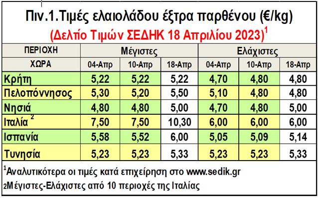 Αιφνίδια και σημαντική άνοδος σημειώθηκε την εβδομάδα 10-18 Απριλίου 2023 στις τιμές στην Ιταλία με τις μέγιστες τιμές του έξτρα παρθένου να φτάνουν στα 10 ευρώ/κιλό στην Pescara και στα 10,30 ευρώ/κιλό στην Ragusa, σύμφωνα με τον ΣΕΔΗΚ.