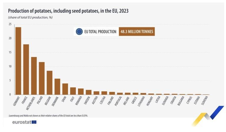 Το 2023, συγκομίστηκαν 48,3 εκατομμύρια τόνοι πατάτας στην ΕΕ, κάτι που αντιπροσωπεύει μια ελαφρά αύξηση σε σύγκριση με το 2022, όταν συγκομίστηκαν 47,5 εκατομμύρια τόνοι.