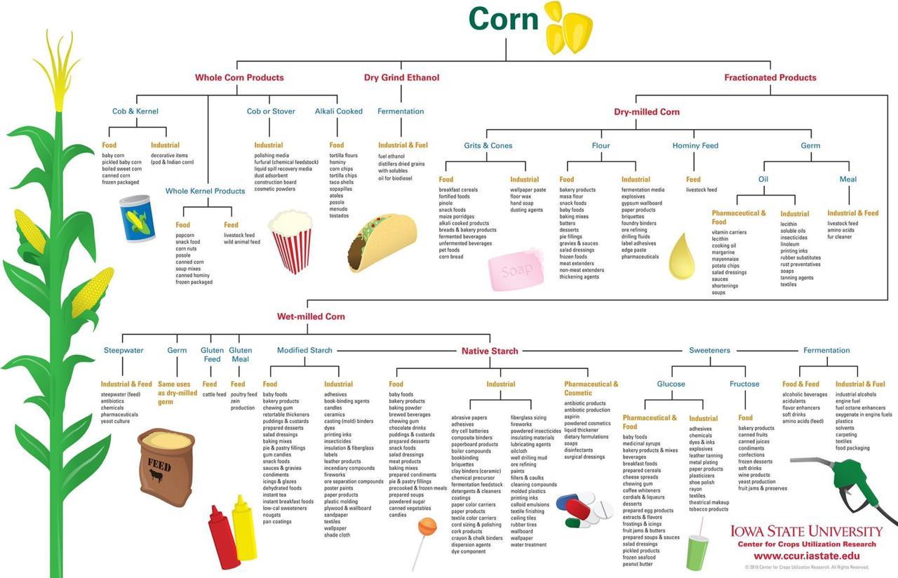 Στο ενδιαφέρον ινφογραφικό που επισυνάπτω στη συνέχεια, του Πανεπιστημίου Iowa State University των ΗΠΑ, δίνεται λεπτομερής λίστα προϊόντων που προέρχονται από το καλαμπόκι με χρήσεις στη διατροφή, τις ζωοτροφές, βιομηχανικές, φαρμακευτικές, συστατικών βιομηχανίας τροφίμων, κλπ... (μπορεί να διαβαστεί ευκρινέστερα και στον σύνδεσμο: https://www.ccur.iastate.edu/files/page/files/cornposter_1.pdf)