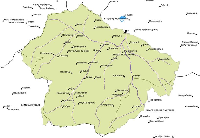 Εικόνα 1. Η απεικόνιση, της «λεκάνης απορροής» (επιφάνεια με «ανοιχτή πράσινη» απόχρωση) (του «”Πάμισου Ποταμού” που αντιστοιχεί έως την θέση στην οποία πρόκειται να κατασκευαστεί το “Φράγμα Μουζακίου”», η οποία βρίσκεται στην ανάντη του οικισμού «Μουζάκι»), του «υδρογραφικού (γραμμικού) δικτύου» (γραμμές με «έντονη μπλε» απόχρωση με διαβάθμιση του πάχους της γραμμής, όπου το πάχος της κάθε γραμμής εξαρτάται από την “τάξη” του εκάστοτε ρέματος που αντιπροσωπεύει δηλαδή όσο μεγαλύτερη είναι η “τάξη” του ρέματος τόσο παχύτερη είναι και η αντίστοιχη γραμμή που το αντιπροσωπεύει), των «οικισμών του Δήμου Πύλης», των «οικισμών του Δήμου Μουζακίου», των «οικισμών του Δήμου Αργιθέας» και των «οικισμών του Δήμου Λίμνης Πλαστήρα» (κουκίδες με «μαύρη» απόχρωση και ονομασία, επίσης, με «μαύρη» απόχρωση), του «περιγράμματος του “Δήμου Πύλης”», του «περιγράμματος του “Δήμου Μουζακίου”», του «περιγράμματος του “Δήμου Αργιθέας”»και του «περιγράμματος του “Δήμου Λίμνης Πλαστήρα ”» (γραμμές με «μαύρη απόχρωση»), όπως απεικονίζονται στο «ελεύθερο διαδικτυακά λογισμικό» «Q.G.I.S.» [4], μέσω των σχετικών αρχείων που ανακτήθηκαν τόσο από την σχετική διαδικτυακή «πλατφόρμα» («Copernicus») όσο και από την σχετική διαδικτυακή «πλατφόρμα» («ΕΛ.ΣΤΑΤ.»),[1,2,4].
