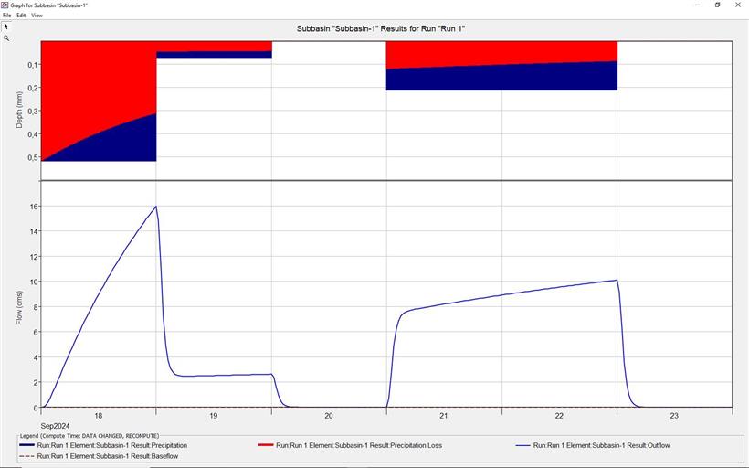 Επιπλέον, αρχικά, στην παρακάτω εικόνα απεικονίζεται το, “προσομοιωμένο ρεαλιστικό”, «ιστόγραμμα βροχόπτωσης» του χρονικού διαστήματος, “18-21/09/2024” (“38,60”), (το οποίο και «απέδωσε» την, “προσομοιωμένη ρεαλιστική”, παροχή αιχμής νερού και συγκεκριμένα «16,00 κυβικά μέτρα ανά δευτερόλεπτο» ή αλλιώς «16,00 m3/sec»), [το οποίο και «απέδωσε», λόγω της τελευταίας βροχόπτωσης, την, “προσομοιωμένη ρεαλιστική”, συνολική ποσότητα νερού, συγκεκριμένα, «2.571.200 κυβικά μέτρα (τόννους νερού)» ή αλλιώς «2.571.200 m3 (τόννους νερού)»], και το αντίστοιχο, “προσομοιωμένο ρεαλιστικό”, «υδρογράφημα πλημμύρας» που προκύπτει από το συγκεκριμένο, “προσομοιωμένο ρεαλιστικό”, επεισόδιο βροχόπτωσης, (λόγω της τελευταίας βροχόπτωσης), (η ανάλυση και οι υπολογισμοί έγιναν με το ελεύθερο στο διαδίκτυο λογισμικό «HEC-HMS» του «U.S.A. Army Corps of Engineers» δηλαδή του «Σώματος Μηχανικών του Στρατού των Η.Π.Α.») [1,2,4,5,6.1,6.2,7].