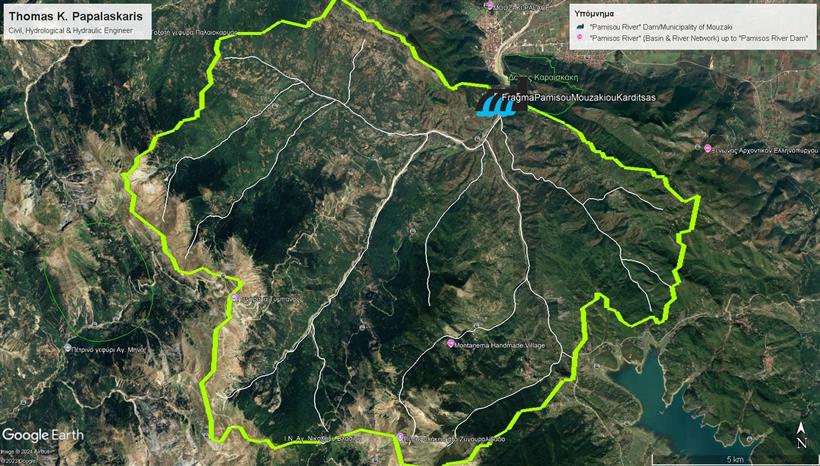Εικόνα 3. Η απεικόνιση της λεκάνης απορροής, [επιφάνεια με «ανοιχτή πράσινη» απόχρωση, που αντιστοιχεί έως την θέση όπου πρόκειται να κατασκευαστεί το «Φράγμα Μουζακίου», (“Δήμου Μουζακίου”), Νομού Καρδίτσας”»] και του (πλήρως ανεπτυγμένου) αντίστοιχου, περιεχόμενου σε αυτήν, υδρογραφικού δικτύου (γραμμές με «λευκή» απόχρωση), του «Ποταμού Πάμισου» επί του υπόβαθρου της διαδικτυακής πλατφόρμας «Google Earth» [1,2,4,10].
