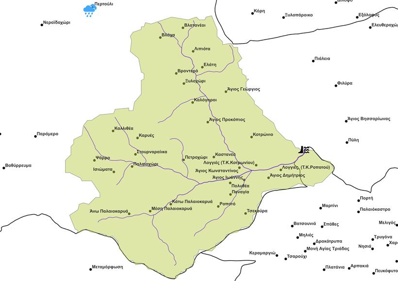Εικόνα 1. Η απεικόνιση, της «λεκάνης απορροής» (επιφάνεια με «ανοιχτή πράσινη» απόχρωση) (του «”Πορταϊκού Ποταμού” που αντιστοιχεί έως την θέση στην οποία πρόκειται να κατασκευαστεί το “Φράγμα Πύλης”», η οποία βρίσκεται περίπου στην θέση ανάμεσα στον οικισμό «Κοτρώνιο» και στον οικισμό «Πύλη»), του «υδρογραφικού (γραμμικού) δικτύου» (γραμμές με «έντονη μπλε» απόχρωση με διαβάθμιση του πάχους της γραμμής, όπου το πάχος της κάθε γραμμής εξαρτάται από την “τάξη” του εκάστοτε ρέματος που αντιπροσωπεύει δηλαδή όσο μεγαλύτερη είναι η “τάξη” του ρέματος τόσο παχύτερη είναι και η αντίστοιχη γραμμή που το αντιπροσωπεύει), των «οικισμών του Δήμου Πύλης», των «οικισμών του Δήμου Μουζακίου», των «οικισμών του Δήμου Αργιθέας» και των «οικισμών του Δήμου Τρικκαίων» (κουκίδες με «μαύρη» απόχρωση και ονομασία, επίσης, με «μαύρη» απόχρωση), του «περιγράμματος του “Δήμου Πύλης”», του «περιγράμματος του “Δήμου Μουζακίου”», του «περιγράμματος του “Δήμου Αργιθέας”»και του «περιγράμματος του “Δήμου Τρικκαίων”» (γραμμές με «μαύρη απόχρωση»), όπως απεικονίζονται στο «ελεύθερο διαδικτυακά λογισμικό» «Q.G.I.S.» [4], μέσω των σχετικών αρχείων που ανακτήθηκαν τόσο από την σχετική διαδικτυακή «πλατφόρμα» («Copernicus») όσο και από την σχετική διαδικτυακή «πλατφόρμα» («ΕΛ.ΣΤΑΤ.»),[1,2,4].