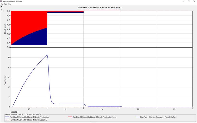 Επιπλέον, αρχικά, στην παρακάτω εικόνα απεικονίζεται το, “προσομοιωμένο ρεαλιστικό”, «ιστόγραμμα βροχόπτωσης» του χρονικού διαστήματος, “18-20/09/2024” (“38,20 mm”), (το οποίο και «απέδωσε» την, “προσομοιωμένη ρεαλιστική”, παροχή αιχμής νερού και συγκεκριμένα «26,30 κυβικά μέτρα ανά δευτερόλεπτο» ή αλλιώς «26,30 m3/sec»), [το οποίο και «απέδωσε», λόγω της τελευταίας βροχόπτωσης, την, “προσομοιωμένη ρεαλιστική”, συνολική ποσότητα νερού, συγκεκριμένα, «1.543.400 κυβικά μέτρα (τόννους νερού)» ή αλλιώς «1.543.400 m3 (τόννους νερού)»], και το αντίστοιχο, “προσομοιωμένο ρεαλιστικό”, «υδρογράφημα πλημμύρας» που προκύπτει από το συγκεκριμένο, “προσομοιωμένο ρεαλιστικό”, επεισόδιο βροχόπτωσης, (λόγω της τελευταίας βροχόπτωσης), (η ανάλυση και οι υπολογισμοί έγιναν με το ελεύθερο στο διαδίκτυο λογισμικό «HEC-HMS» του «U.S.A. Army Corps of Engineers» δηλαδή του «Σώματος Μηχανικών του Στρατού των Η.Π.Α.») [1,2,4,5,6.1,6.2,7].