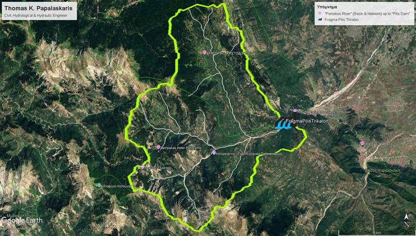 Εικόνα 3. Η απεικόνιση της λεκάνης απορροής, [περίγραμμα επιφάνειας με «ανοιχτή πράσινη» απόχρωση, που αντιστοιχεί έως την θέση όπου πρόκειται να κατασκευαστεί το «Φράγμα Πύλης», (“Δήμου Πύλης”), Νομού Τρικάλων”»] και του (ελαφρά συνεπτυγμένου) αντίστοιχου, περιεχόμενου σε αυτήν, υδρογραφικού δικτύου (γραμμές με «λευκή» απόχρωση), του «Ποταμού Πορταϊκού» επί του υπόβαθρου της διαδικτυακής πλατφόρμας «Google Earth» [1,2,4,10].