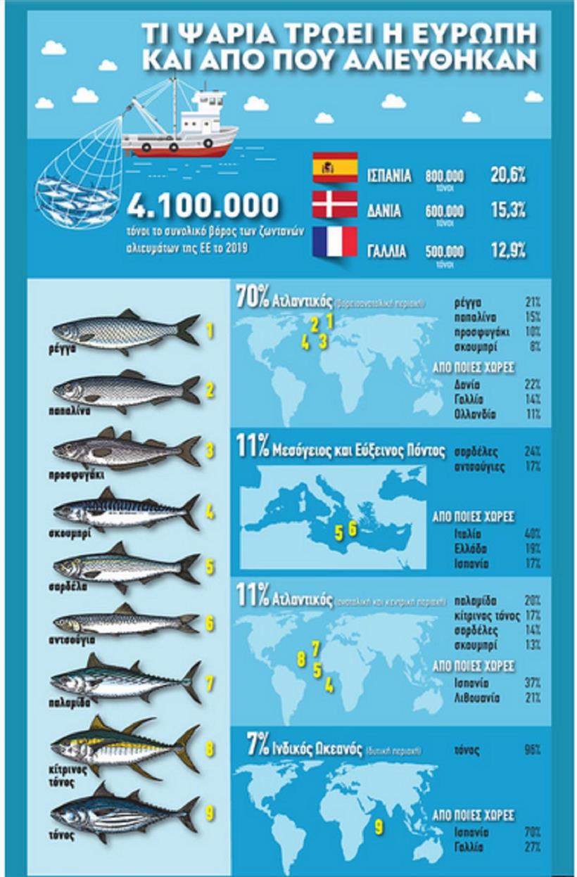 Περίπου το 70% των συνολικών αλιευμάτων της ΕΕ αλιεύθηκε βορειοανατολικά του Ατλαντικού, σύμφωνα με τα στοιχεία της Eurostat που αποτυπώνονται στο γράφημα.