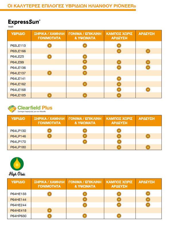 Απάντηση: Η Corteva Agriscience προσφέρει τα υβρίδια της PIONEER συμβατά με διάφορα συστήματα ζιζανιοκτονίας ,όπως με τα συστήματα Clearfield, Clearfield Plus και ExpressSun. Τα υβρίδια που προσφέρουμε ειναι κατάλληλα για διάφορες κλιματολογικές συνθήκες και εδαφολογικές συνθέσεις,και απαιτήσεις της αγοράς. Με διαφορετικά ποσοστά περιεκτικότητας σε λάδι και ολεϊκό οξύ, καλύπτοντας τις ανάγκες της αγοράς και το βασικότερο τις ανάγκες των καλλιεργητών ηλίανθου.